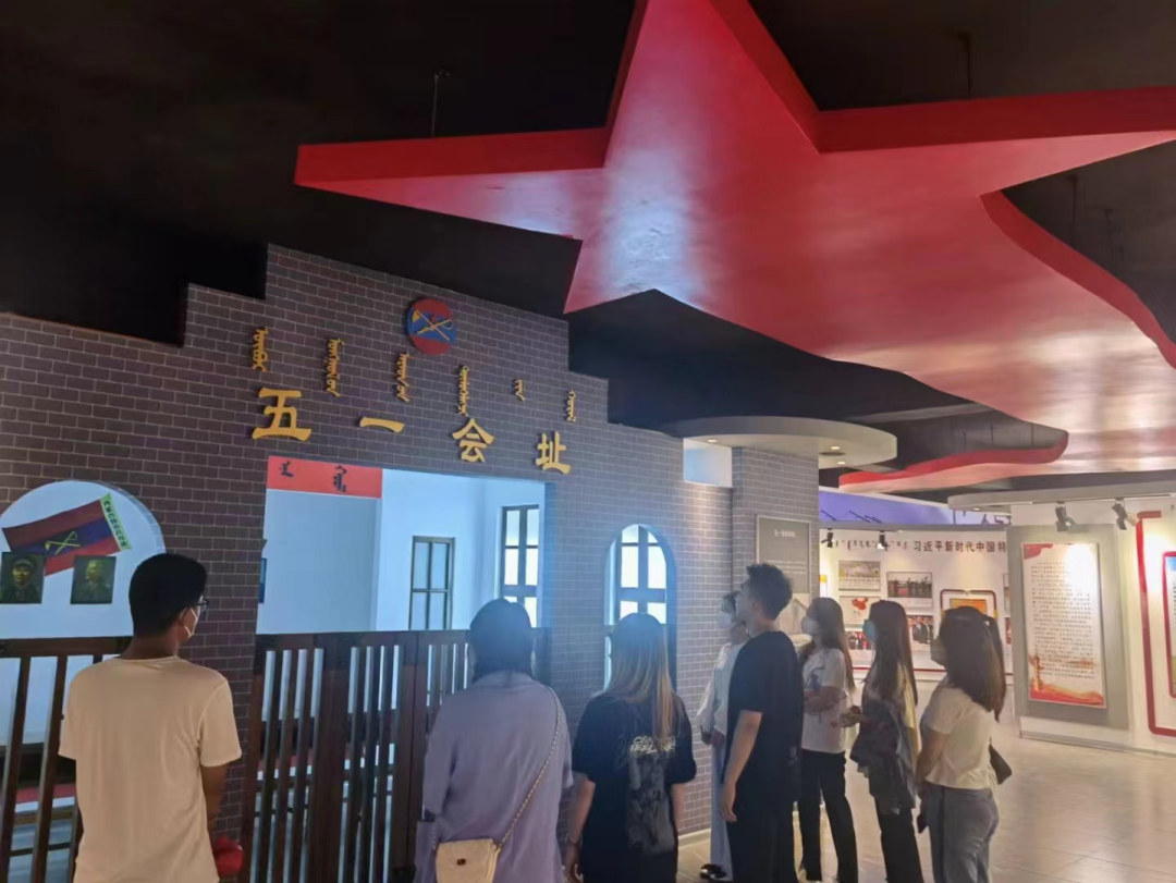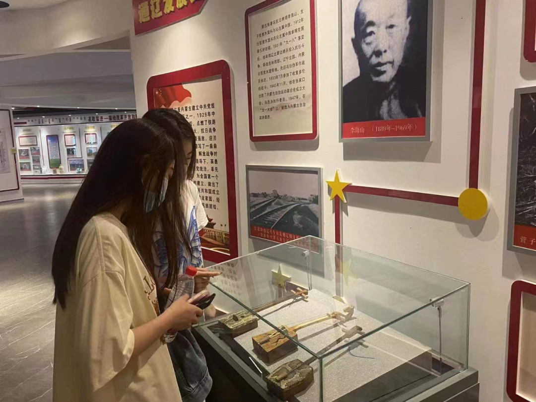 通辽市开发区党群活动中心作为集立体性、灵活性、实用性于一体的党史学习教育情景课堂,内设党史厅、中国精神厅等七个主题展厅,及统战群团活动室、社会组织党群活动室等八个功能活动室,是党史学习教育的新型红色阵地。在讲解员的带领下,实践队队员们来到中国精神厅近观一件件文献物品、一幅幅历史照片,并通过红色影片共同缅怀老一辈革命功绩,感受红色史诗,回忆风雨飘摇的革命岁月,重温中国共产党百年奋斗历程。队员们充分领略到了中国精神的深刻内涵,了解中国精神背后的故事,体会革命先辈锐意进取、开拓创新的高尚品质。