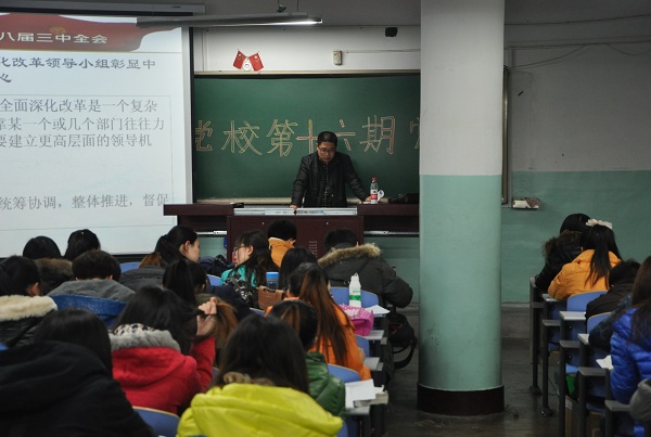 首先,赵国年老师讲述了十八届三中全会的主要内容:要求全面深化改革,总目标是完善和发展中国特色社会主义制度,推进国家治理体系和治理能力现代化。让一切劳动、知识、技术、管理、资本的活力竞相迸发,让一切创造社会财富的源泉充分涌流,让发展成果更多更公平惠及全体人民。接下来的课上,孟昭武老师又为大家详细讲解了《中国共产党章程》的主要内容,并且强调了入党志愿书的格式与注意事项。