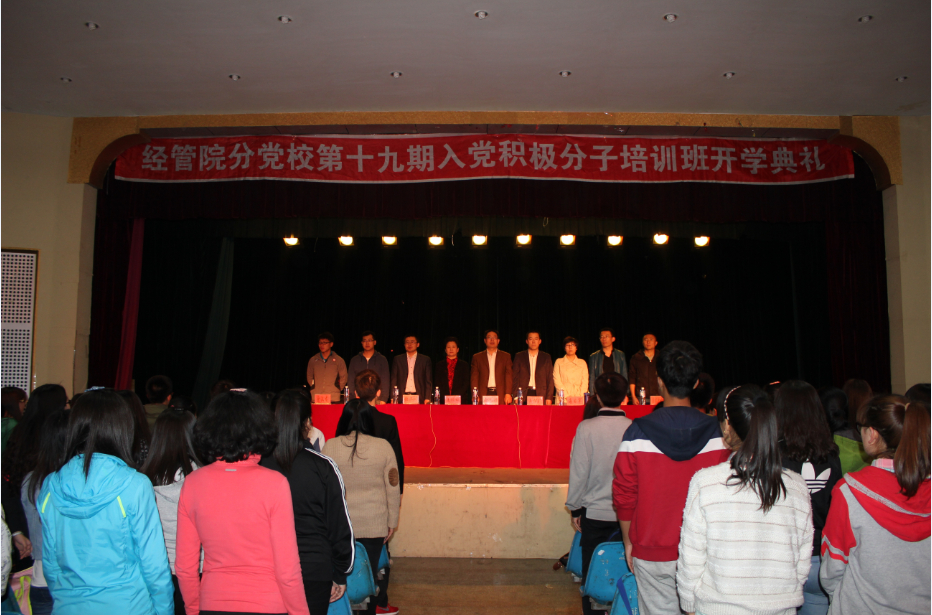 公司太阳成集团tyc33455于2014年4月16日晚在东区礼堂举行“经管院第19期积极分子开学典礼”,公司党委书记赵国年、副书记王智广、党委组织员王瑞梅、团委书记张卫中等学办老师出席典礼。
