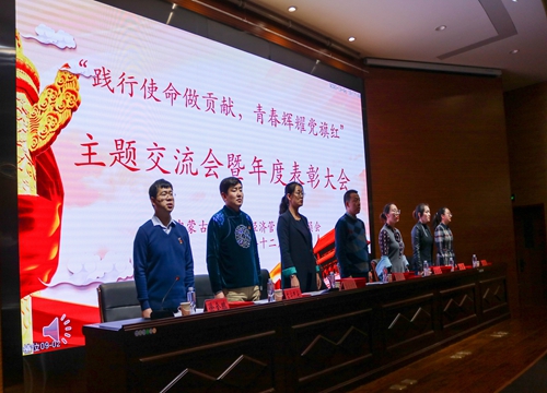12月24日晚,公司于经管院123报告厅开展“践行使命做贡献,青春辉耀党旗红”主题交流会暨年度表彰大会。公司党委书记王智广、党委副书记斯日古楞、团委书记海日罕、员工工作办公室副主任苏宁巴乐,以及辅导员白灵、李洁老师出席本次大会。本次会议由员工工作办公室主任徐金鹏老师主持,公司员工党员、重点培养对象和入党积极分子培训班优秀学员代表参会。