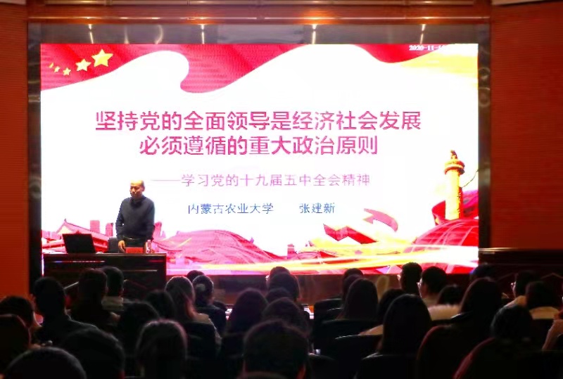 张建新老师的辅导报告以“坚持党的全面领导是经济社会发展必须遵循的重大政治原则”为中心,强调了“一个重要判断”和“一个重要调整”,并围绕我国经济社会发展中的问题,从四方面讲解了党治国理政的解决方案,与会人员认真学习了五中全会精神。