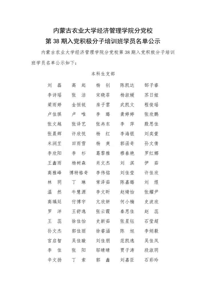 太阳成集团官方网站分党校第 38 期入党积极分子培训班学员名单公示如下: