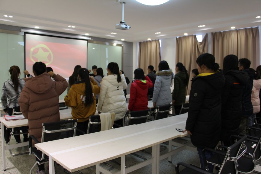 活动上,团支书首先向同学们说明了此次活动开展的目的及要求。随后,组织同学们一同欣赏了“青春喜迎十九大,不忘初心跟党走”手绘海报,由每位参赛选手为同学们讲解绘图要素及其构想。最后,团支书带领31名共青团员重温入团誓词,“我志愿加入中国共产主义青年团,坚决维护中国共产党的领导,遵守团的章程……”,伴随着整齐响亮的入团宣誓声活动圆满结束。