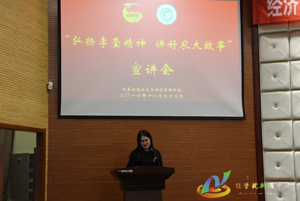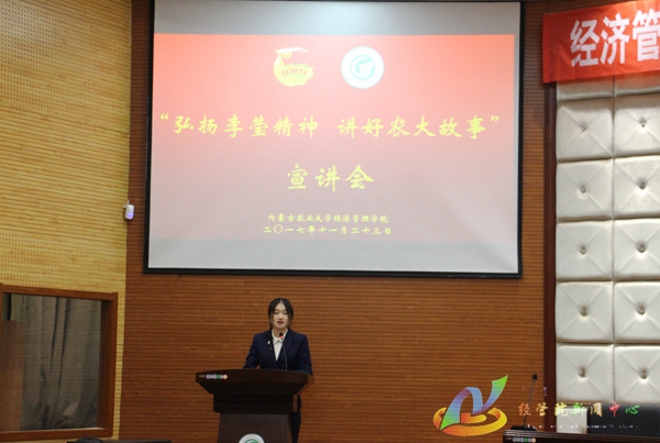 为充分发挥典型引路示范带动作用,让青年学子更深入了解李莹的感人事迹,学习和弘扬李莹精神,11月23日晚7:00,经管院团委员工会组织部举办了以“弘扬李莹精神,讲好农大故事”为主题的宣讲会。活动由公司员工工作办公室老师郭祎天主持,17级部分同学参加。