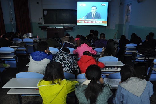 贾老师在会议中说道学习“两会”精神、了解“两会”知识是每一个现代老员工应具备的义务与职责。员工干部作为同学们学习的榜样,理应发挥骨干带头作用,积极的去学习’“两会”。本次会议播放了习近平主席在第十二届全国人大代表大会第一次会议上的讲话及李克强总理第十二届全国人大第一次会议记者会的视频,所有员工干部都认真观看学习。