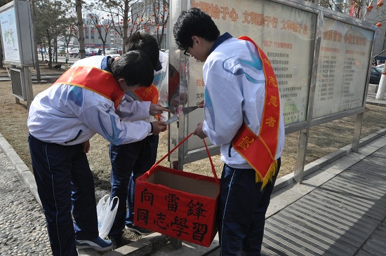 全体师生在广场中央举行“学习雷锋精神、深化志愿服务”倡议活动并宣誓。在雄言壮语中,我们能感受到广大师生学习雷锋 “钉子精神”的坚定的决心,自愿贡献自己的一份微薄之力,在平凡的行动中做出一份不平凡的精神。之后同学们对新华广场的地面和死角进行了清扫,对栅栏和浮雕进行了擦拭,清除了宣传栏上粘贴的小广告,同时还向新华广场的群众进行了学习雷锋精神的宣传。