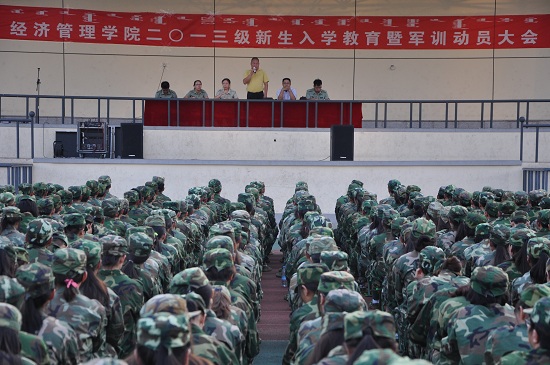 8月25日18:00,经管院于东区操场组织召开了2013级新生教育暨军训动员大会,经管公司党委书记高潮、党委副书记赵国年、学办主任高兵以及学办海日罕、徐金鹏、余汉龙老师出席了本次会议,2013级全体新生参加了动员大会。