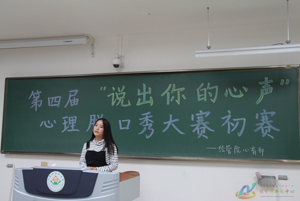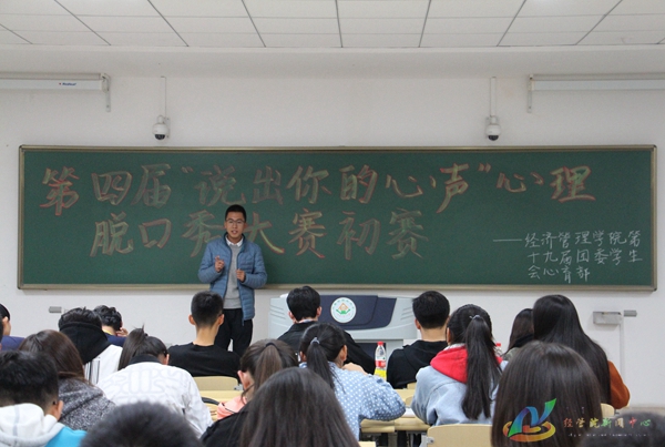 为了同学们的丰富校园生活,锻炼同学们的口才能力,11月3日晚7:00,经管院团委员工会心育部于南教318、319教室开展了第四届“说出你的心声”心理脱口秀大赛初赛,各部长担任此次比赛的评委,全体报名同学及各班心育委员参加此次大赛。