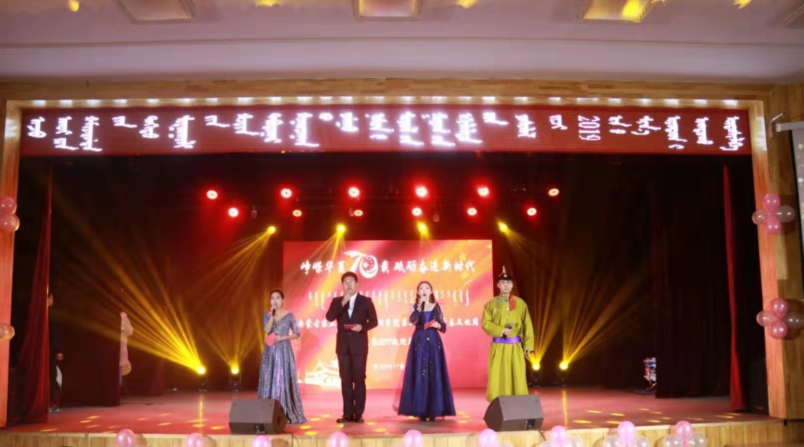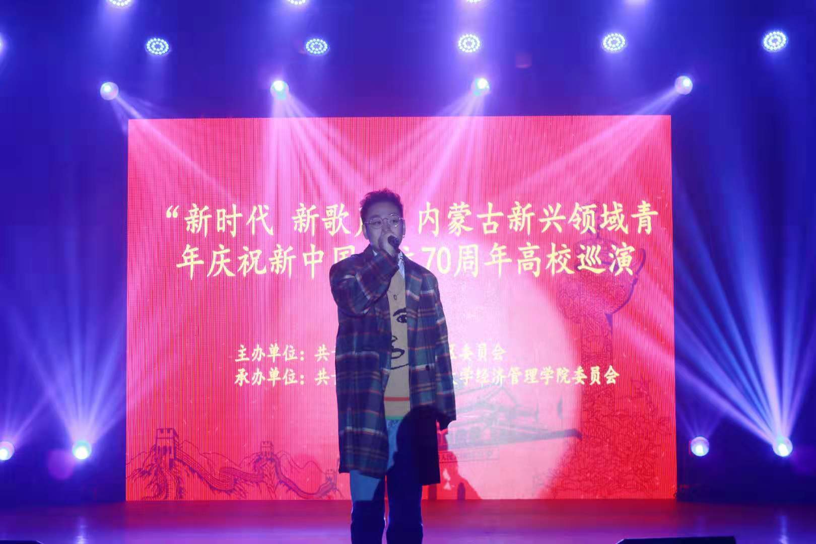灯光旖旎,华裳齐舞。 晚会伴随着老师和连长的视频寄语拉开帷幕,光线乐队劲爆的开场歌曲带同学们走进这场欢聚盛宴。古典舞与现代舞的完美结合使观众穿梭时空,感受时代变化。随后,“新时代,新歌声”内蒙古新兴领域青年代表上官大叔,为庆祝新中国成立70周年开展高校巡演活动,特邀为公司演唱原创歌曲《呼和浩特》和《小气鬼》,将晚会推向高潮。蒙古姑娘热情似火,蒙古儿郎健壮奔放,金马杯捧杯作品《梦回草原》带观众领略了蒙古草原儿女的热情与奔放。表演过半,中场的抽奖互动环节再次点燃同学们的热情。三句半《厉害了,我的国》花样表白祖国,《乌兰巴托的夜》唱出蒙古之夜的寥廓与壮美。最后,作品《我和我的祖国》以诵唱形式向祖国七十周年献礼。
