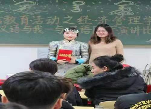在主持人的引导下,参赛选手按顺序上台演讲。参赛选手们围绕着“与汉语同行”主题,讲述着与汉语的故事。选手们精神饱满、感情充沛、表达流畅、沉着应战,并同台下观众进行互动,现场气氛热烈,掌声连连,将气氛推向高潮。在比赛中场休息时,农经三班阿勇嘎、娜黑亚,农经四班胡伊茹乐、格根莲花同学为观众表演了一段蒙古语歌舞串烧。比赛接近尾声,会计三班的兴安同学为观众献上了蒙语诗。