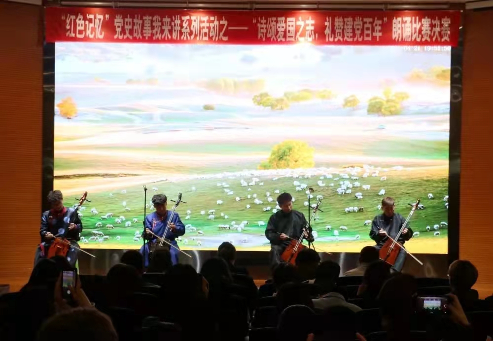 经过层层选拔,共有10组选手入围决赛,为我们带来精彩的朗诵作品。他们意气风发、自信昂扬,在背景音乐的衬托之中或激情演绎,或慷慨激昂,或娓娓道来,以蕴含极强韵律性、节奏感的朗诵带我们回顾建党百年伟业,展望美好未来。中场气势磅礴的马头琴曲目《神马》,尽显草原魅力。整场比赛令人肃然起敬,引发情感共鸣,赢得阵阵掌声。比赛结束后,白灵老师对历经近200人层层选拔和为期28天精心准备的朗诵比赛做出总结,对参赛选手作品及现场表现做出点评,她希望同学们以此次主题朗诵比赛为契机,认真学习传承中国共产党在长期奋斗中构筑的精神谱系,赓续共产党人精神血脉,让党史学习教育入脑入心,激发大家学党史、知党恩、跟党走的强大动力。奋进前行建设新篇章。