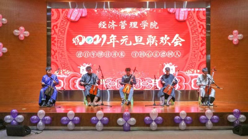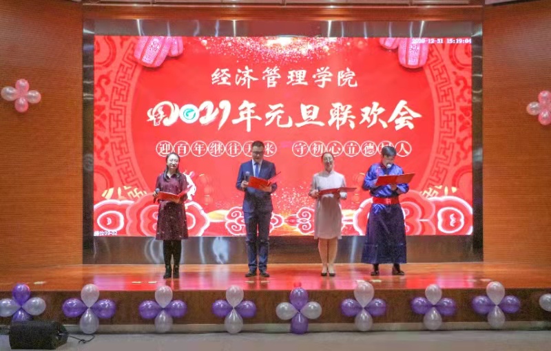 伴着悠扬动听的马头琴声,公司2021年元旦联欢会拉开帷幕。经理乔光华致辞,从疫情防控、教学科研、人才培养、校企合作等十方面总结回顾了公司2020年工作中取得的成绩,寄语全体教职工乘势而为,再立新功。接下来公司教职工带来一场歌舞盛宴:农林经济管理系和市场营销系分别表演了情景歌曲《朝花夕拾》和诗朗诵《不忘初心 为爱坚守》,充分展现了老师们工作之余的魅力;会计学系的合唱歌曲《爱我中华》,呈现了中华大地的宏伟蓝图和炎黄子孙的自强不息;斯日古楞副书记独唱的草原经典歌曲《天边》旋律优美、余音缭绕;经济学系盖志毅老师朗诵的伟人诗词声情并茂、热情激昂;工商管理系带来的古诗版《三句半》,幽默风趣的方言赢得阵阵掌声;由新进教师带来的《可爱摆》活力四射、激情飞扬;张博、高博等老师带来的《唐伯虎点秋香2》惟妙惟肖地演绎着农大师生间的趣事;行政人员小合唱的《天佑中华》以其饱含深情的基调演唱出坚强自信的爱国之情。