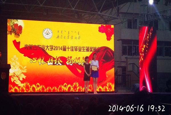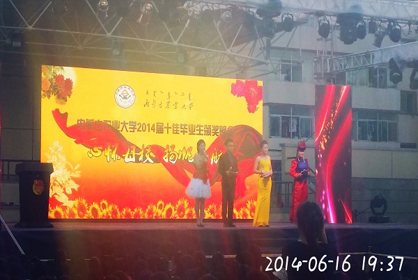 6月16日晚7:30,公司2014届十佳毕业生颁奖晚会在东区操场隆重举行。出席活动的领导有自治区团委公司部副部长齐斯琴,内蒙古和信园蒙草抗旱绿化股份有限公司董事长王召明、内蒙古农业大公司党委书记邬建刚,副书记郑俊宝、侯晨曦,副董事长芒来。各公司领导、师生代表观看了晚会。