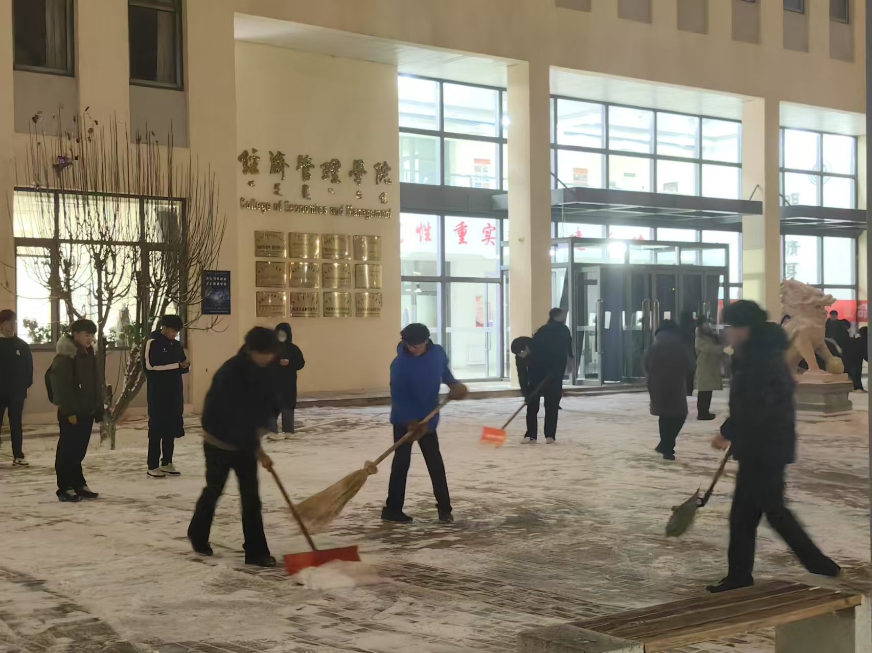 青马班成员们闻雪而动,迅速集结。他们手持铁锹、扫帚等工具,如同身披战甲的战士,奔赴扫雪战场。寒风凛冽,却吹不散他们的热情;冰雪刺骨,却冻不住他们的决心。他们分工有序,有的奋力铲雪,有的细心清扫,每一锹都充满力量,每一扫都饱含责任。在他们的齐心协力下,校园内的道路逐渐恢复了原本的模样,一条条安全通道在他们的脚下延伸开来。