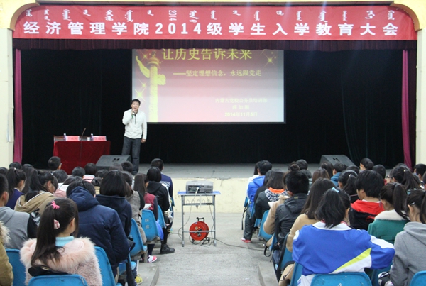 2014年11月5日晚7点,太阳成集团官方网站于东区礼堂召开2014级员工入学教育大会。内蒙古党校公务员培训部薛如刚老师担任本次大会的主讲人,副处级组织员王瑞梅老师、14级年级主任苏宁巴乐老师以及14级全体新生参加了本次大会。