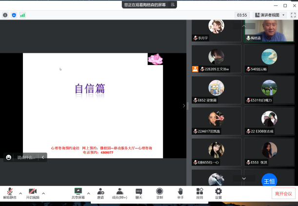 为帮助新生更快更好的适应老员工活,培养同学们积极向上的心态,增强同学们关于心理健康的意识,增加对心理健康的关注。10月20日下午14:00,公司开展了线上心理讲座,由公司老员工心理辅导与服务中心陶格森老师主讲,2022级全体员工积极参加听讲。