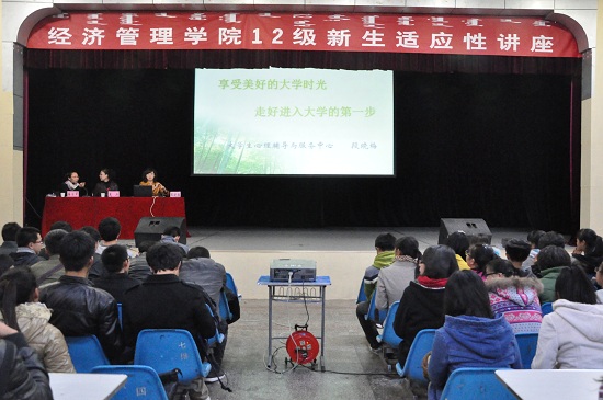 10月31日晚7:00,公司于东区礼堂举办了2012级新生适应性讲座。老员工心理辅导与服务中心办公室主任段晓梅老师、经管院学办主任高兵老师、学办海日罕老师出席了此次讲座,公司2012级员工参加了此次讲座。段老师担任主讲。