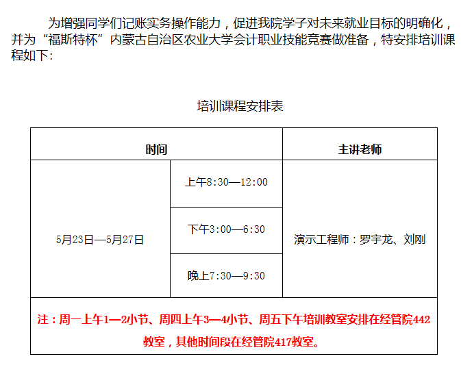 关于“福斯特杯”内蒙古自治区农业大学会计职业技能竞赛课程安排通知