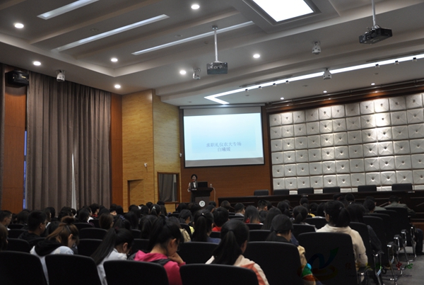 讲座开始,白曦媛老师指出此次讲座主要围绕面试时“穿什么、做什么、说什么”三方面展开。她强调面试时应仪容得体、自信大方,并分别对男生和女生的服饰、仪表做了详细指导。白曦媛老师还将其在工作和面试过程中积累的多年经验和智慧毫无保留的分享给了同学们,她针对面试题型,介绍了面试特点及应对技巧。现场还进行了实战演练,白曦媛老师提出问题,让同学现场作答。讲座持续了近两个小时,现场气氛浓烈。最终,张卫中老师以一句“大学四年,精彩一刻,顿悟一时,精彩一生”结束了此次讲座。