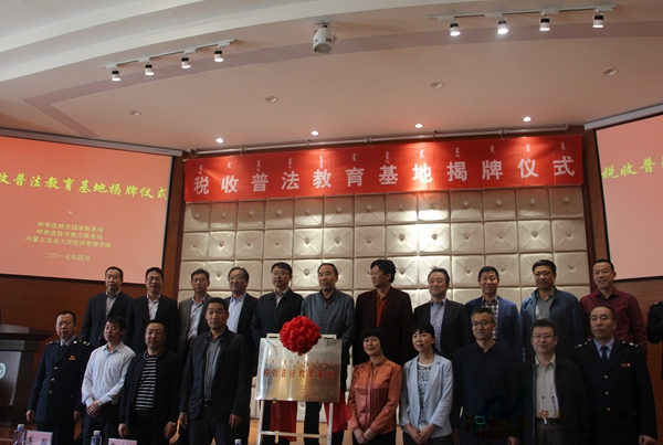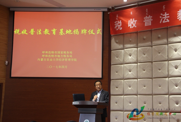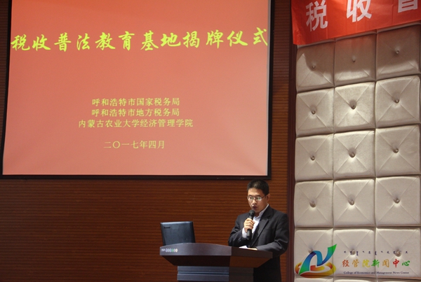仪式上,呼和浩特市国税局党组书记、局长连翰首先致辞,他指出我国大力支持高校毕业生积极创业,在税收税法宣传教育第七个五年规划中尤其提出要通过深入开展税收法制宣传教育,所以要大力发挥公司第一课堂的作用,唱响税收主旋律,传播税收法制理念,在全社会营造依法纳税的文明风尚。呼和浩特地税局党组书记、局长赵哲民表示深化国地税合作,搭建税收法制平台,具有深远意义,它通过公司与员工将税法普及到社会,开辟了普法教育新领地,开启了税法宣传新形势。公司党委书记赵国年表示公司是以本科教学为中心、以团队建设为龙头、以农林经济管理专业为特色、经济学和管理学两个学科门类共同发展、具有鲜明地区特色、学科特点和专业特长的自治区经济管理高级专业人才培养基地。指出公司始终以培养人才为中心,坚持第一课堂与第二课堂联动,此次税收普法基地的设立,搭建了税与校的桥梁,我们将以税收普法教育基地、税收讲堂为载体,充分利用国税局、地税局的专业力量,进一步加强税法有关知识建设,让同学们扎实掌握税收税法知识。他希望同学们以此次活动为契机,充分了解税收知识,牢固树立法律意识,利用自己专业知识为国家税收事业贡献绵薄之力。