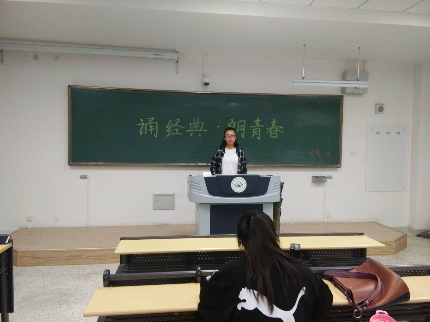 活动上,各班团支书组织同学们以宿舍为单位,进行朗诵经典爱国诗词,以激发同学们学习爱国诗词的兴趣,充分把爱国情怀融入到生活当中。在朗诵过程中,同学们精神饱满,都将自己的最好水平和最佳状态发挥得淋漓尽致,每个班级都徜徉着荡气回肠的爱国热情和慷慨激昂的浩然正气。