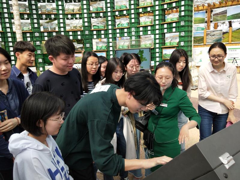 内蒙古蒙草生态环境股份有限公司是一家以“草”为业的科技型生态企业,同时是公司实践教育基地,董事长王召明作为公司优秀员工,为公司人才培养计划提供了大力支持。公司主营种业科技和生态修复两大业务。在草博园工作人员的带领下,大家参观了呼和塔拉万亩草原修复项目、昆虫旅馆、种子的一帘幽梦、种质资源库、小草之家、内蒙古土壤类型分布区等,体验了不怕踩的“快乐小草”等,同学们认真听取了工作人员对于蒙草公司的发展历史、产品种类和未来发展战略的介绍,详细了解了企业发展草产业、致力于驯化野生植物应用于生态恢复和生态环境建设的情况。