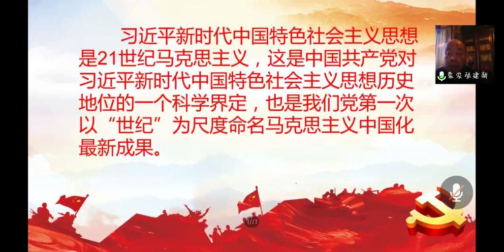 课上,张建新老师就习近平新时代中国特色社会主义思想的历史地位这一主题展开了讲述。张老师谈到习近平新时代中国特色社会主义思想是21世纪马克思主义,这是我们党第一次以“世纪”为尺度命名马克思主义中国化最新成果。而以“世纪”为尺度命名就要具备以下三个条件:一是理论研究对象是世界典型样本,二是理论成果具有世界历史意义,三是理论实践成效深刻改变现实世界。随后,张建新老师在治理、信任、和平、发展的中国方案方面进行详细讲述。中国方案,是习近平新时代中国特色社会主义思想的重要内容,也是习近平新时代中国特色社会主义思想冠名“21世纪马克思主义”的第一要件。
