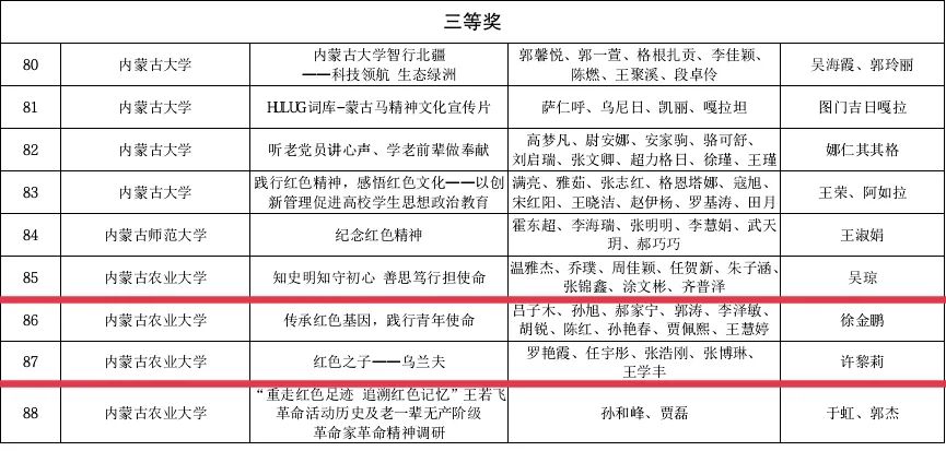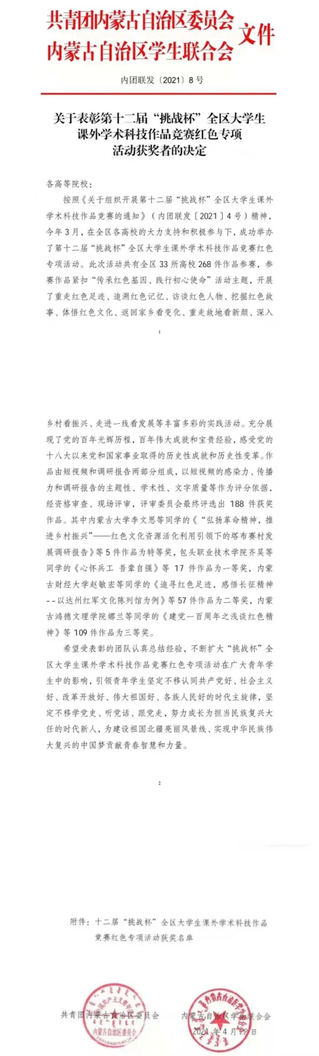 近日,共青团内蒙古自治区委员会与内蒙古自治区员工联和会发布《关于表彰第十二届“挑战杯”全区老员工课外学术科技作品竞赛红色专项活动获奖者的决定》。其中,公司由徐金鹏老师指导,吕子木、孙旭、郝家宁、郭涛、李泽敏、胡锐、王慧婷等同学呈现的作品《传承红色基因,践行青年使命》与由许黎莉老师指导,罗艳霞、任宇彤、张浩刚、张博琳、王学丰同学呈现的作品《红色之子—乌兰夫》荣获三等奖。
