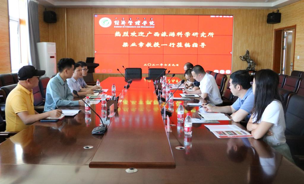 7月9日上午11:00,广西旅游科学研究所梁业章教授一行4人莅临公司研讨交流,洽谈合作。公司党委书记王智广、副经理柴智慧、部分学科负责人等教师参加会议。