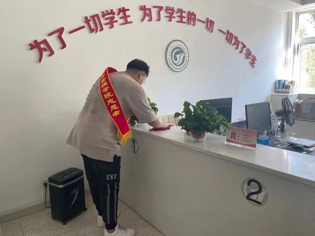 青年志愿者们各司其职,有序地展开清扫工作,通过擦门窗、扫地、拖地、搬桌凳、摆放办公用品等实际行动,对教师办公室的卫生进行全面清理,为老师营造一个良好的办公环境。此外,志愿者们还对公司卫生进行清扫,将公司内的玻璃、门框、桌子等一一擦拭,统一将教师办公室、报告厅、会议室等地的垃圾回收并妥当处理。本次志愿活动约持续一小时,志愿者们齐心协力、配合默契,既用实际行动展表现了对教师的感恩之情,同时也收获劳动的成就感和满足感。