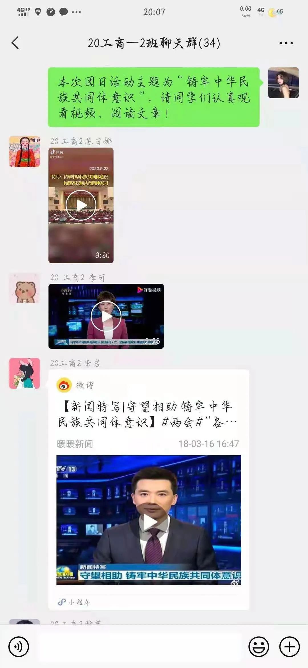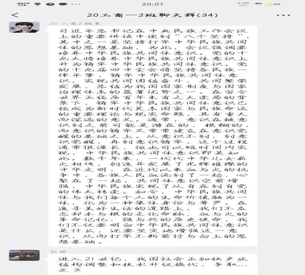 2月21日,2020级工商管理二班于微信开展“铸牢中华民族共同体意识”线上主题团日活动。本班团支书组织活动,全班同学积极参加。
