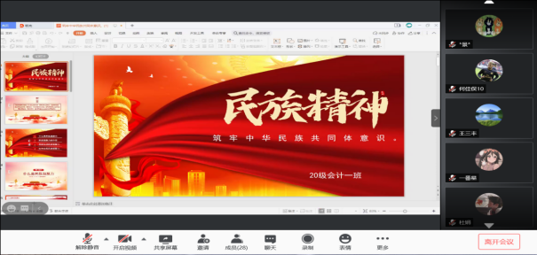 为全面学习贯彻党的民族政策,引导公司学子进一步增强民族文化认同感和中华民族共同体意识。2月19日,公司2020级会计学一班于腾讯会议开展了“铸牢中华民族共同体意识”线上主题团日活动。班级团支书组织活动,全体同学积极参加。