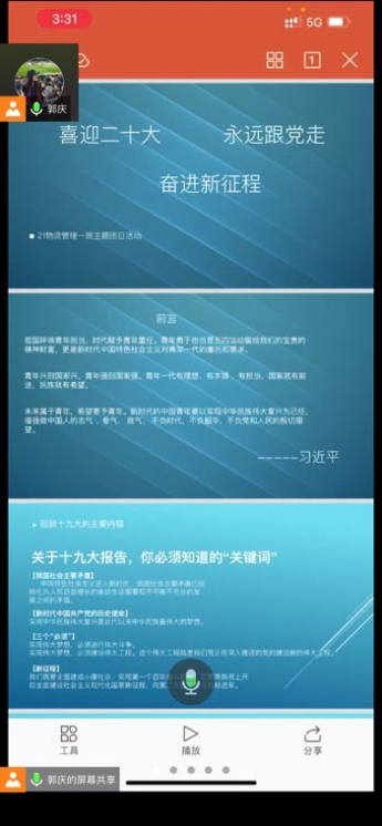 3月17日,公司2021级物流管理一班于线上开展“喜迎二十大、永远跟党走、奋进新征程”主题团日活动。本次活动由团支书郭庆主持,全班同学积极参加。