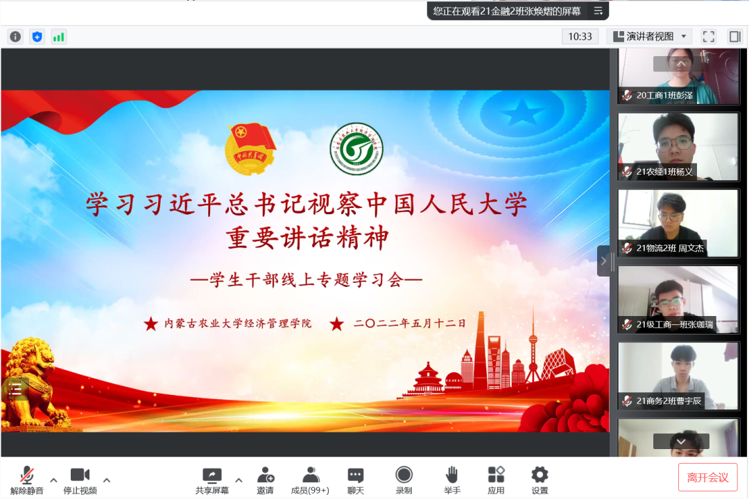 牢记青年革命的光辉历程,赓续民族复兴的伟大使命。此次线上专题学习会的开展,激发了公司员工干部的责任感、使命感,进一步明确奋斗目标与前进方向,助力广大经管青年将所学所感融入学习生活,以青春书写“请党放心、强国有我”的铮铮誓言。