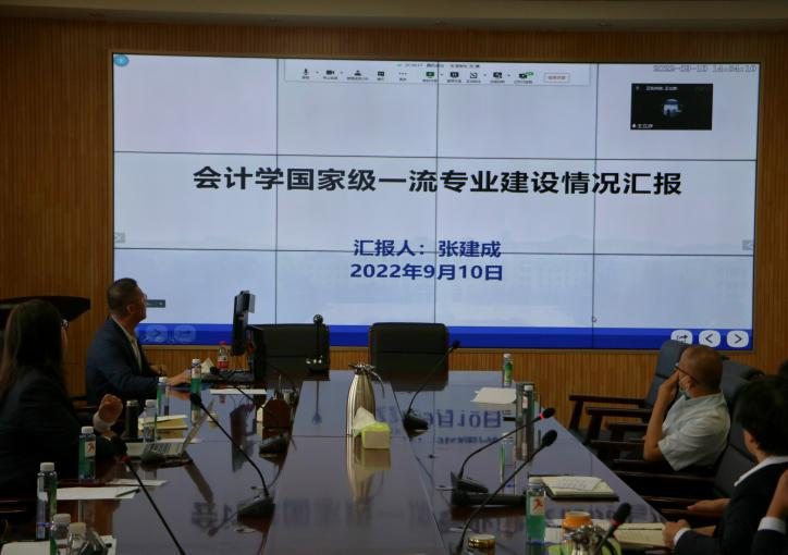 张建成副经理就公司会计学专业基本情况;专业培养方案、课程体系、专业方向聚焦;建设目标及目标达成情况;员工就业、历届员工联络情况;存在的问题和不足及下一步工作计划等方面对公司会计学国家级一流专业建设情况进行了汇报。