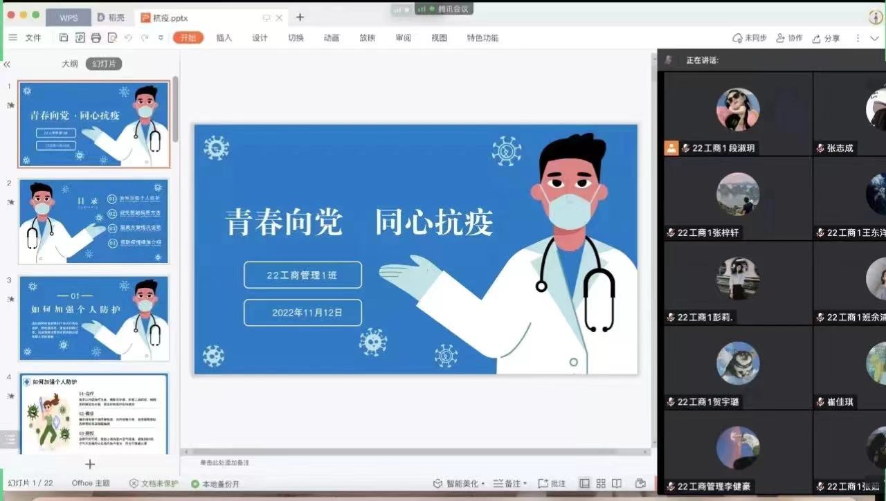 活动中,团支书带领同学们共同重温党的二十大会议,领悟党的二十大精神,了解我们党所取得的伟大成就,观看抗疫事迹,学习战疫期间一线工作人员舍小家顾大家、勇于担当的精神,帮助同学们更加全面学习领悟与弘扬伟大抗疫精神。同学们在活动中也积极展开集体讨论,分享自己的学习感想和疫情期间暖心小故事,纷纷表示将继续秉持坚定不移跟党走、矢志不渝践初心的信念,不负韶华不负时代,争做堪当民族复兴重任的时代新人,积极投身“抗疫赛道”,让青春在抗疫大局中闪闪发光。