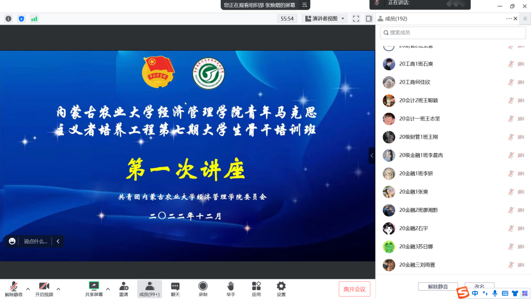 为深入学习宣传贯彻党的二十大精神,加强公司青年学子思想建设,推动公司员工工作迈上新台阶,近日,公司于线上开展“青年马克思主义者培养工程”第七期老员工骨干培训班第一次讲座,马克思主义公司教授扎布老师主讲,青马班全体学员积极参加。