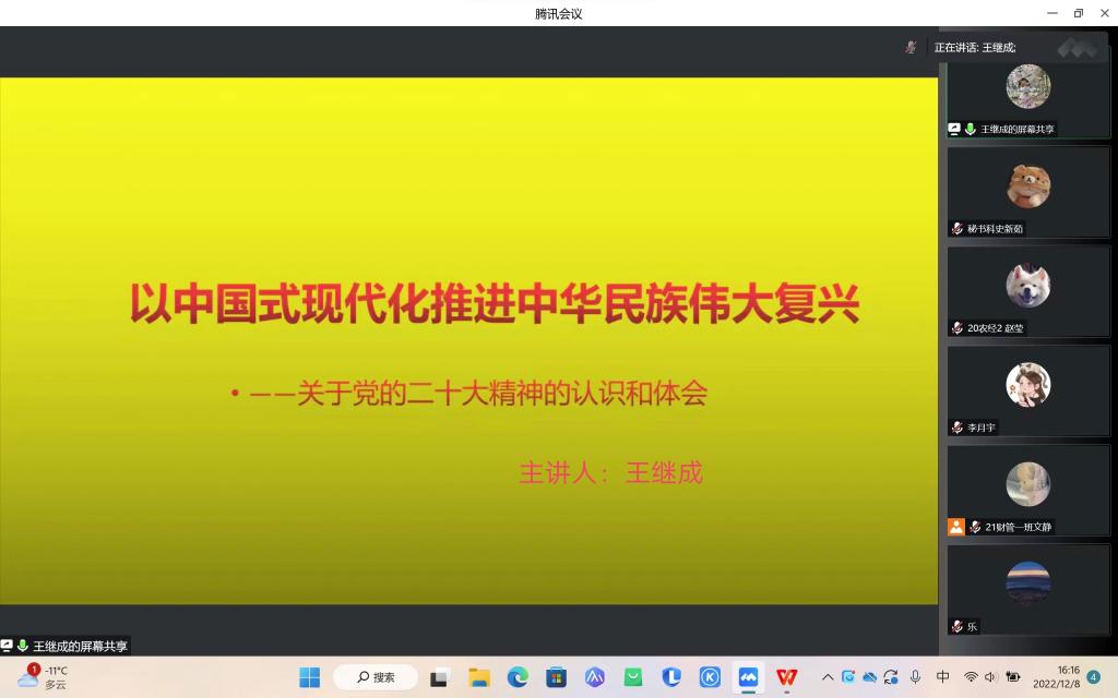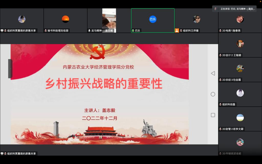 为加深重点培养对象的理论素养,本次培训重点围绕学习党的二十大精神,开展了四次线上党课培训,分别以“以中国式现代化推进中华民族伟大复兴”“乡村振兴战略的重要性”“中国式现代化的中国特色和本质要求”“中国共产党的‘精神谱系’”为主题展开。为巩固学习效果,课后共开展四次主题讨论课,每位同学围绕主题积极展开讨论,分享自己的见解,不断加深对于中国特色社会主义的道路自信、理论自信、制度自信、文化自信,学员们进一步端正了入党动机,坚定了共产主义信仰,加强了自身对中国共产党的认识。