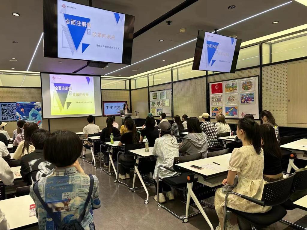 参观实习包括参观证券发展历程、参加股票发行注册制改革讲座两个环节。在参观环节中,国融证券投教基地工作人员通过多媒体展示、实物展品、互动游戏等形式,围绕发展历程、运行模式、发展特色三方面情况向到访师生们详细介绍了我国证券市场的基本知识、投资理念、风险防范等内容。同学们认真学习了解我国证券市场的发展历史和现状,还亲身体验了模拟交易和证券知识竞赛等活动,感受到了证券市场的魅力和挑战。讲座环节中,国融证券专业人员对我国今年全面实行的股票发行注册制改革进行了细致讲解,同学们在与国融证券工作人员的交流和探讨中深入了解证券行业的前沿动态和发展趋势,为今后的学习和就业提供了有益参考。