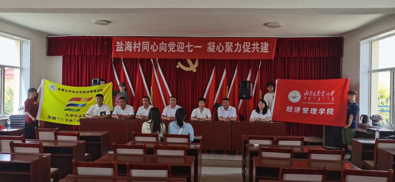 第一天,实践队参与巴彦淖尔市乌拉特前旗盐海村党支部开展的“同心向党迎七一凝心聚力促共建”主题党日活动,本次活动从“重温入党誓词永葆入党初心”,“强化党性教育争做合格党员”,“表彰先进党员培树先进典型”三部分进行。通过本次活动,实践队员深刻认识到新时代青年应当把投身基层作为青春的“必修课”,主动到基层一线摸爬滚打、强筋壮骨,让基层沃土滋青春之花。