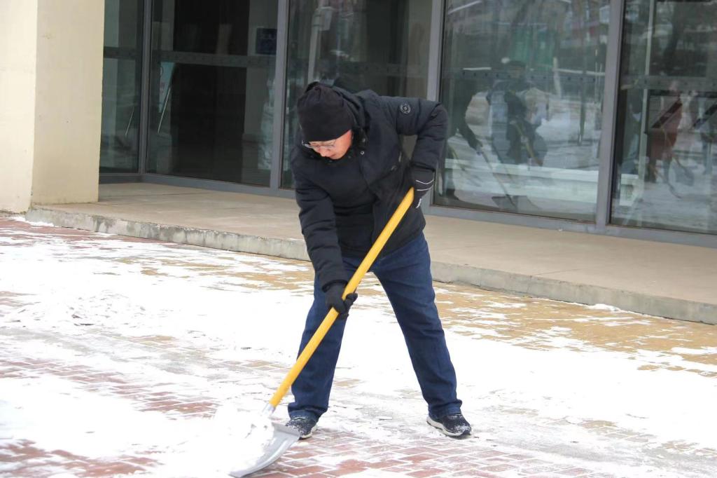 12月17日中午,公司员工于员工公寓A、B、C座、食堂周边及宿舍区生活超市的周边道路进行积雪清扫,他们迅速集结、分工明确,以最快的速度扫除路面上的积雪,铲除坚硬的冰块,以实际行动展现为同学服务的青春风采。