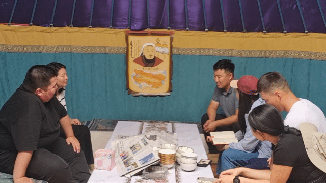 而此次行程中最令人激动和难忘的,莫过于与上海三千孤儿之一全国劳动模范老党员牧户访谈调研。老阿爸所属为别力古台镇阿拉坦杭盖嘎查,前辈用他的亲身经历,为我们农林经济管理锡盟实习组讲述了坚守初心、扎根草原,带领牧民致富的感人故事。老一辈牧民的奉献精神和对家乡的深情,犹如一盏明灯,照亮了我们前行的道路。