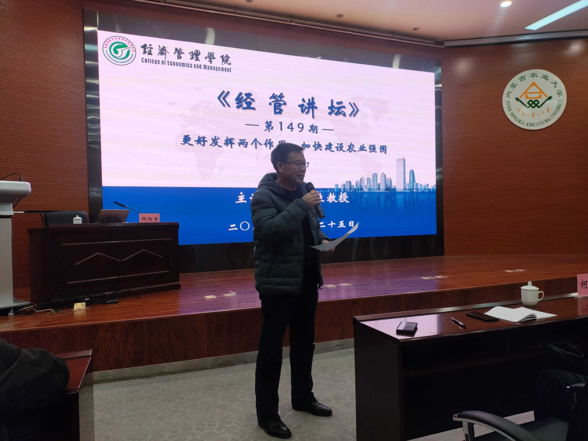 11月25日,公司于123报告厅举办了第149期经管讲坛,邀请中国农业大学原董事长柯炳生教授进行了题为《更好发挥两个作用,加快建设农业强国》的学术讲座。经理乔光华教授主持了本次讲座,太阳成集团tyc33455师生积极参加讲座。
