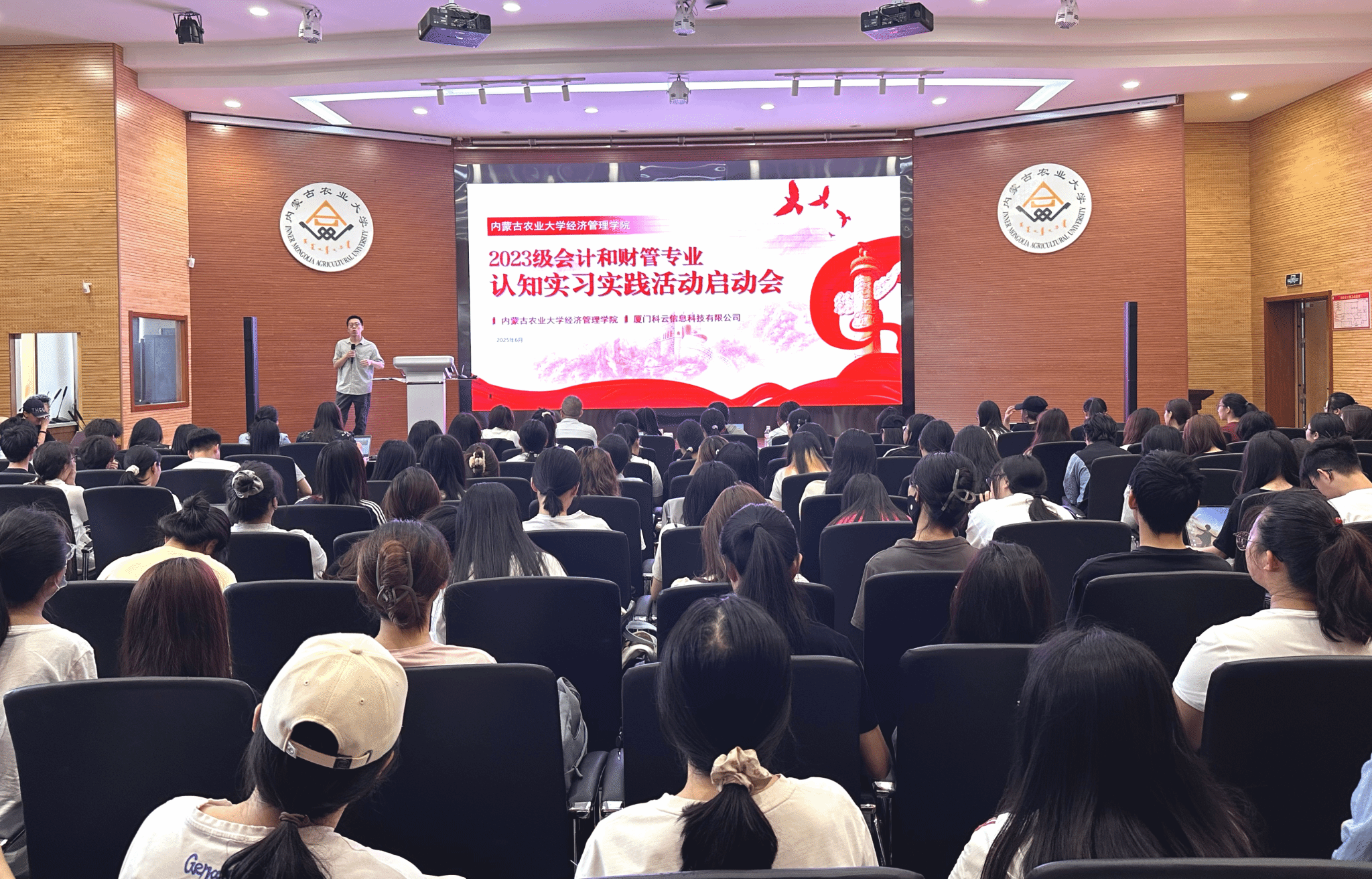 2025年6月26日,2023级会计学和财务管理专业认知实习暨劳动教育实践活动在公司123报告厅开展,会计系主任张旭光、实验教学中心主任赵欣,实习指导教师代表石芳、范文娟、陶华和许黎莉,厦门科云信息科技有限公司院校事业部副总经理谢晓玲、教育研究院副经理林剑平等出席启动会。