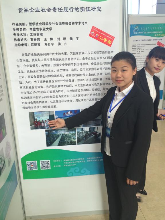 本届“挑战杯”以“挑战青春万众创新”为主题,竞赛自3月份启动以来,在公司领导重视下,公司团委成立工作组,广泛宣传、严格选拔,参赛员工和指导教师精心选题、认真准备,为公司最终取得优异成绩奠定了坚实基础。本次竞赛公司团委共选送7件作品参赛,由赵丽霞,海日罕,佛力老师指导,2012级工商管理班石春霞,刘源,王婷,侯宇四位同学上报的《食品企业社会责任履行的实证研究》作品获得了二等奖的好成绩。