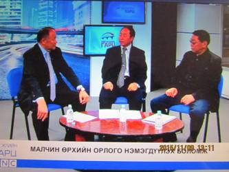 图片为 胡尔查教授(中)和蒙古国生命科学大学巴达拉其教授一起在接受蒙古国新闻电视采访。