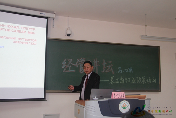11月23日下午4:00,经管院于南教217教室举办了第112期《经管讲坛》,特邀蒙古国生命科学大学经济与商公司苏・巴达拉其教授为公司蒙族师生做了以《蒙古国畜牧业政策动向》为题的学术讲座,公司副经理宝音都仍主持了本次讲座。