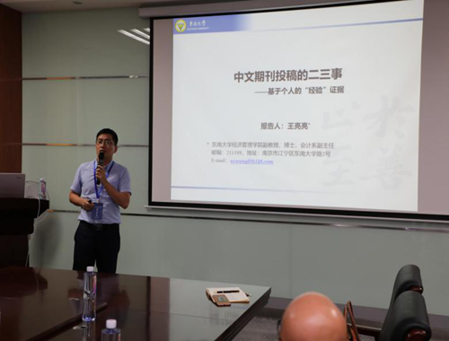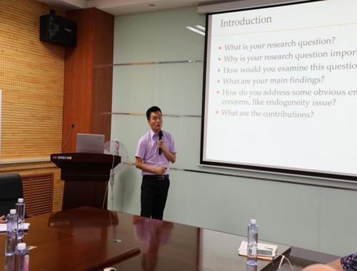 晚上7:30于太阳成集团官方网站举行了以国家级课题申报及高端论文发表经验交流的学术沙龙。济南大学副教授窦欢、苏州大学福教授周中胜、东南大学副教授王亮亮、西安交通大学教授齐保垒分别就基金申请经验分享、国家社科基金申请相关问题探讨、中文期刊投稿二三事以及Howto craft a research paper四个方面分享经验。