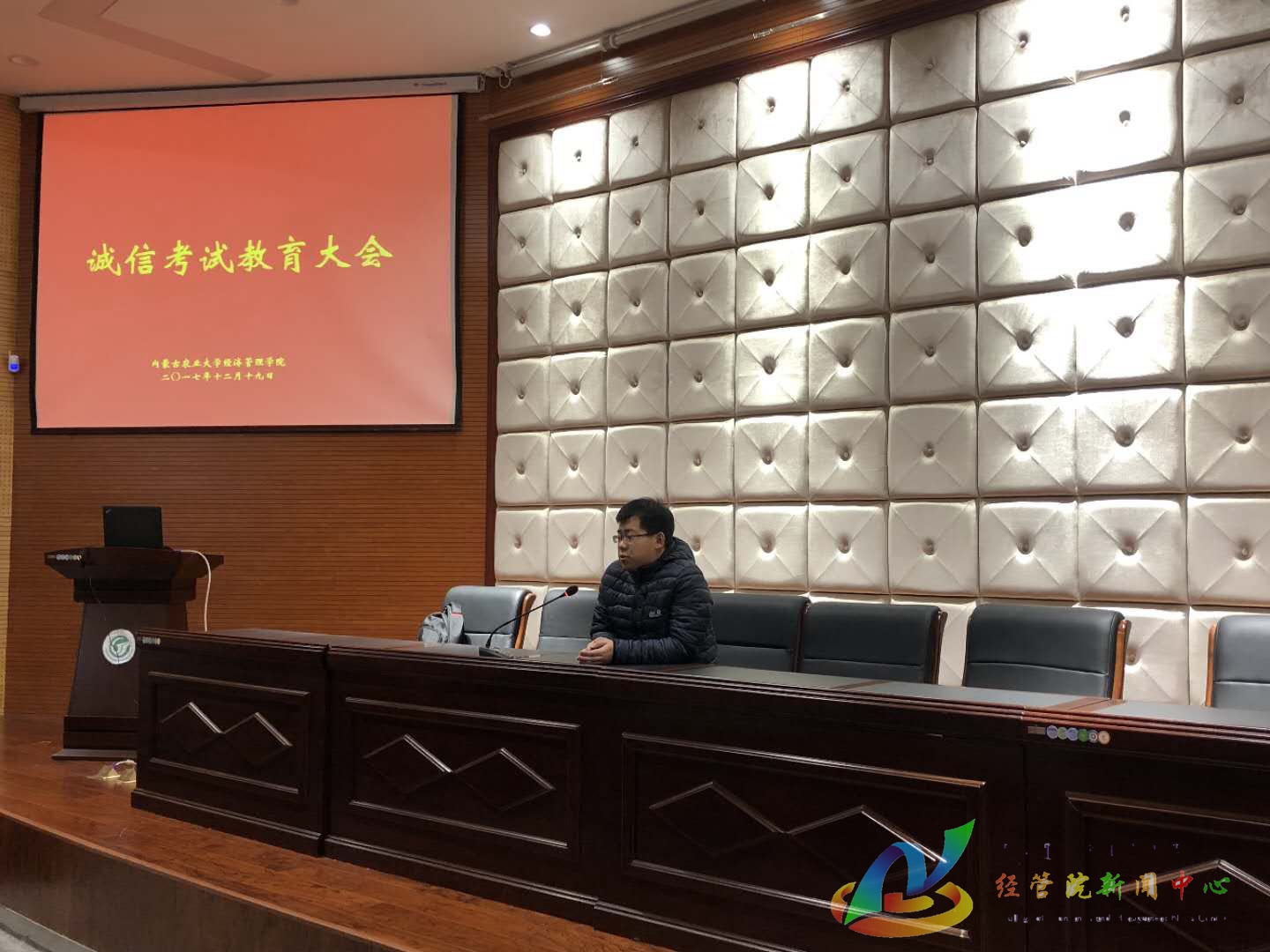 为加强学风建设,严肃考风考纪,12月19日中午12:00,经管院于公司123报告厅召开诚信考试教育大会,公司员工工作办公室副主任徐金鹏担任主讲人,各班班长团支书参加此次大会。