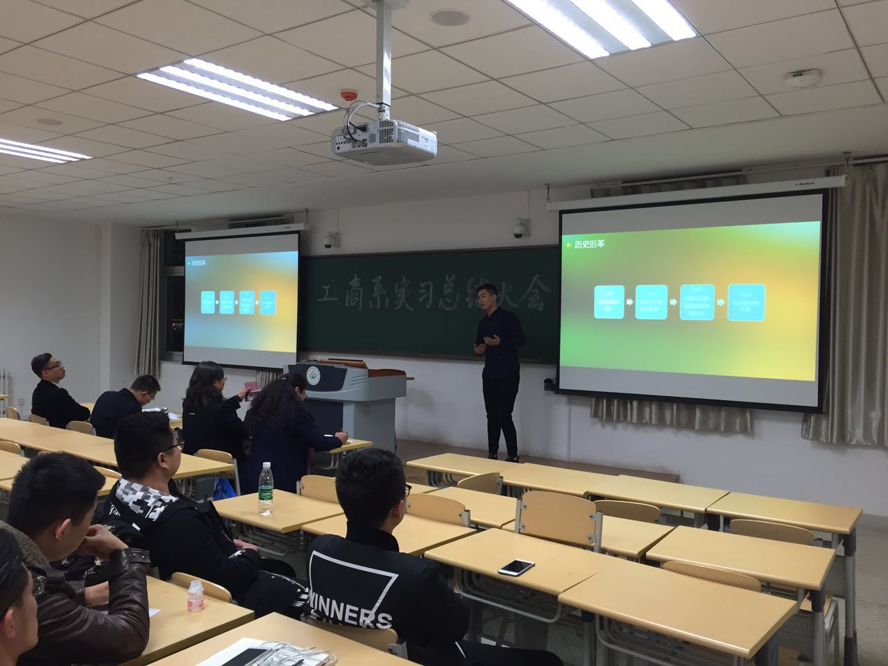 2016年11月15晚,工商管理专业在新区南教223举行了实习报告总结大会,刘豫杰老师、柴智慧老师、王芳老师、郑喜喜老师及全体13级工商系员工参加本次总结大会。